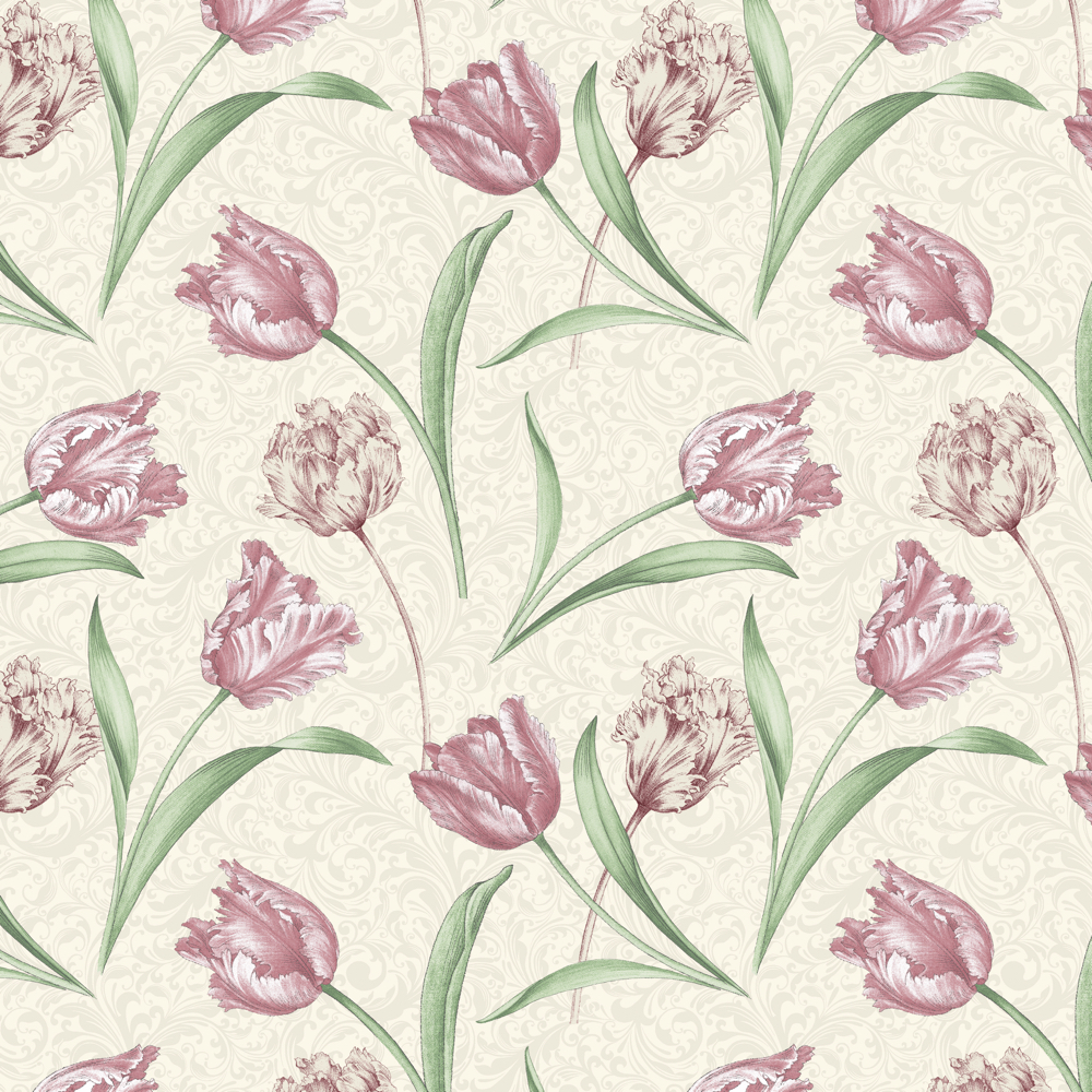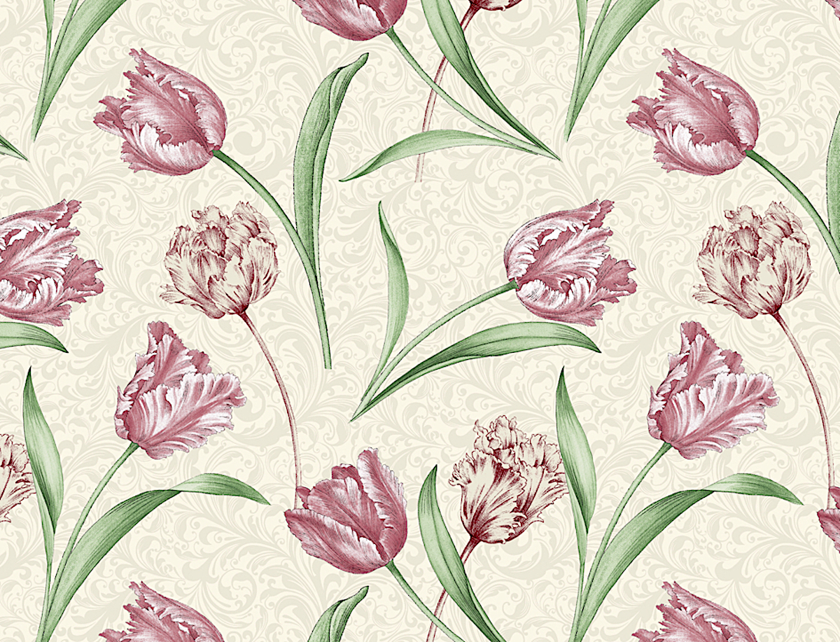 Diese Tulpen liegen auf einem sehr schönen Hintergrund, der von ton in ton Ornamenten geprägt ist.